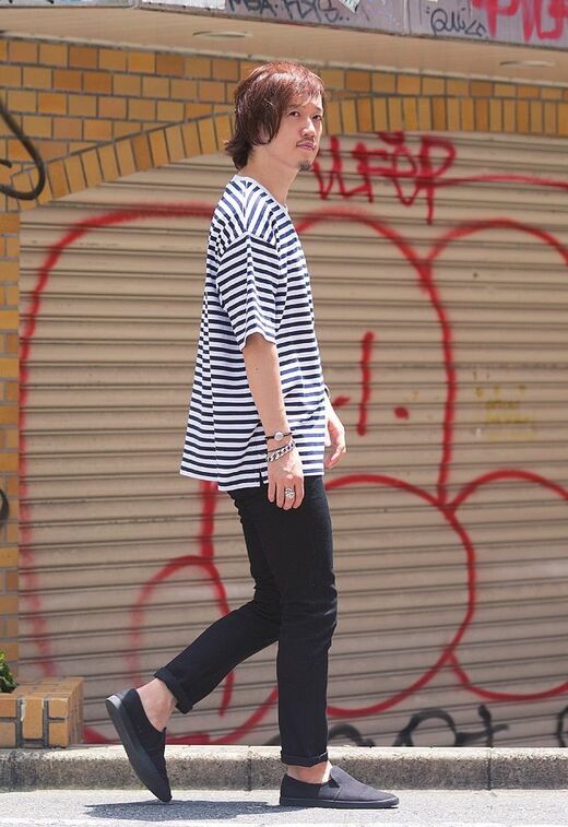 おなかポッコリ中年体形の方は「Y」を実践しましょう。出っぱったおなかはビッグサイズのTシャツなどで隠して、その分、下半身をすっきり細めに。