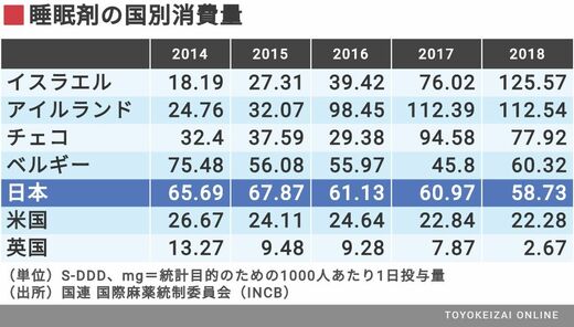 では、海外ではどうか。国ごとに医療制度が違うので単純に比較できないが、よく使われているのが国連の国際麻薬統制委員会(INCB)がまとめている報告書がある。ここにベンゾジアゼピン系薬剤を含む睡眠薬の人口当たりの消費量をまとめた統計がある(※注1)。