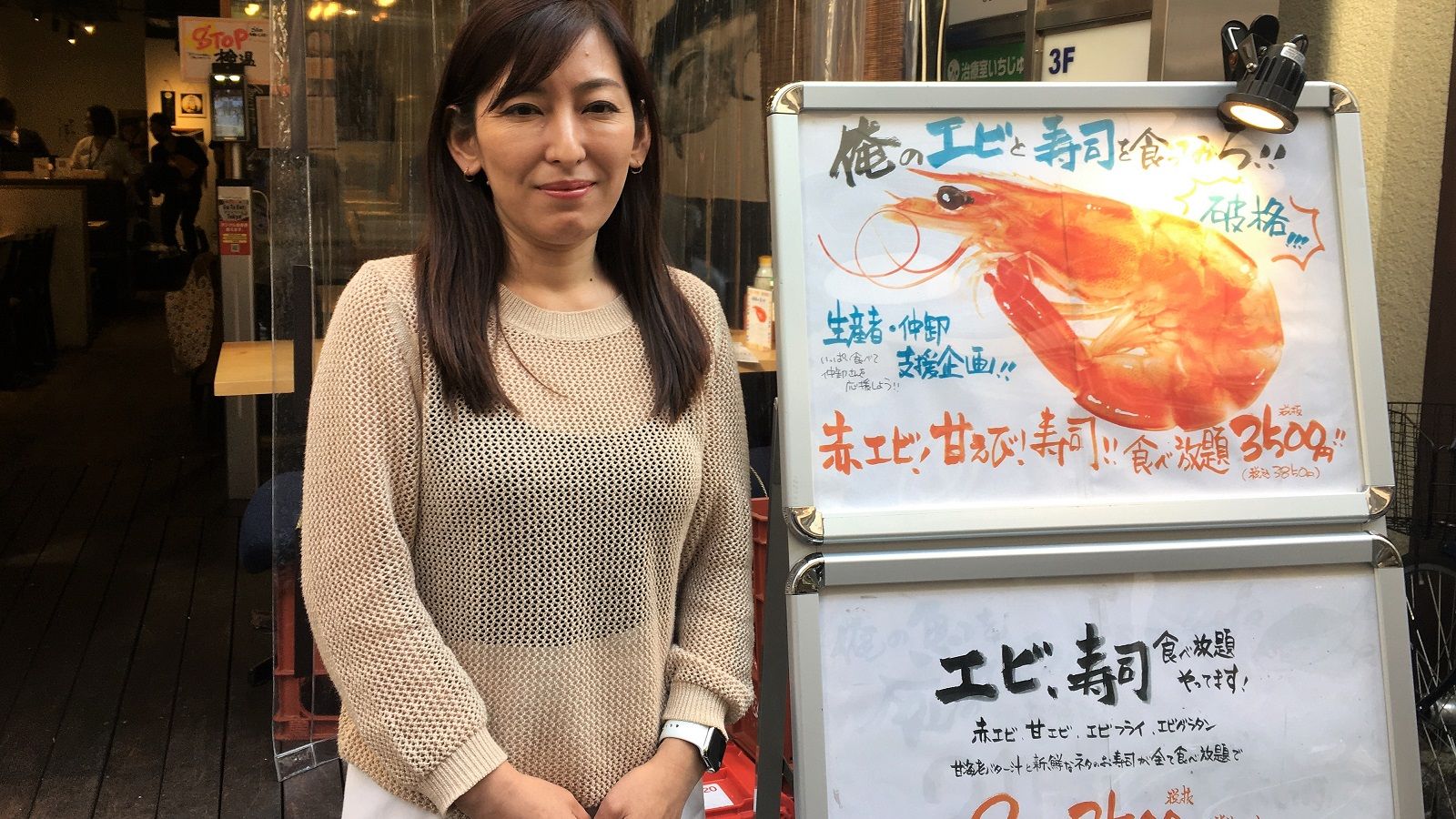 記事に戻る 「3850円寿司食べ放題」実施した社長が見た光明 TikTokを通じて広まり、魚介の仕入れ量は3倍にの写真一覧 海鮮居酒屋「俺の魚を食ってみろ!!」を運営する株式会社AO代表取締役の前原妙子氏。1月の緊急事態宣言発出より、仲卸業者・生産者の応援企画として「海鮮、寿司食べ放題」を 実施。「すべての人の幸せ」を経営理念に、客、社員、仲卸業者、生産者が互いにwin-winな事業を目指し奮闘している(筆者撮影) 1/4 下に画像が続きます 「俺の魚を食ってみろ!!」では3850円でエビ、寿司が食べ放題。赤エビ、甘エビのそれぞれ刺身と、焼き赤エビ、揚げ甘エビの4種類を提供する。カレーマヨネーズ、エビマヨネーズなどの味変も楽しめる。写真下のエビフライ、エビグラタンも同店自慢のメニュー(筆者撮影) 2/4