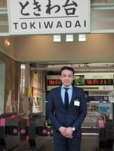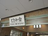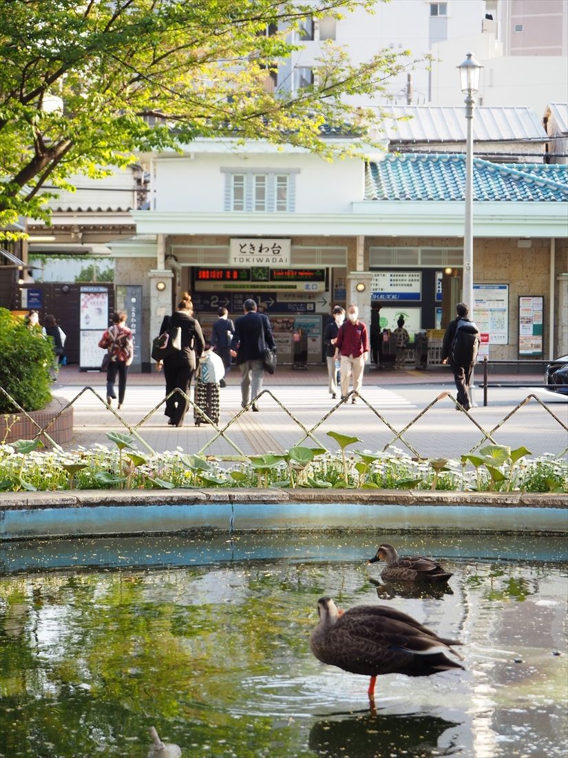 池のある駅前広場とときわ台駅舎(記者撮影)