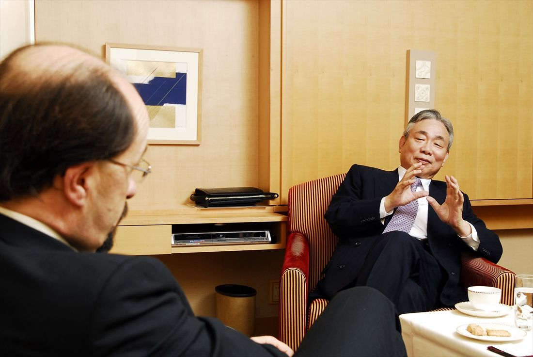 英『エコノミスト』誌元編集長のビル・エモット氏(左)と対談する葛西氏=2009年(撮影:梅谷秀司)