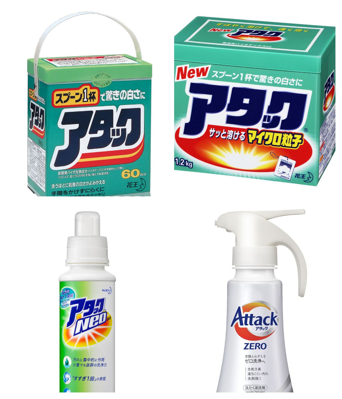 記事に戻る 花王「アタック」34年も洗剤首位に君臨できる理由 洗濯機、衣類の大変化に向き合い進化を怠らないの写真一覧 下に画像が続きます 1987年発売時の「アタック」、2001年の「アタック マイクロ粒子」、2009年の「アタックNeo」、2019年の「アタックZERO」。粉末から液体に変わり、パッケージも一新された(写真:花王) 7/7