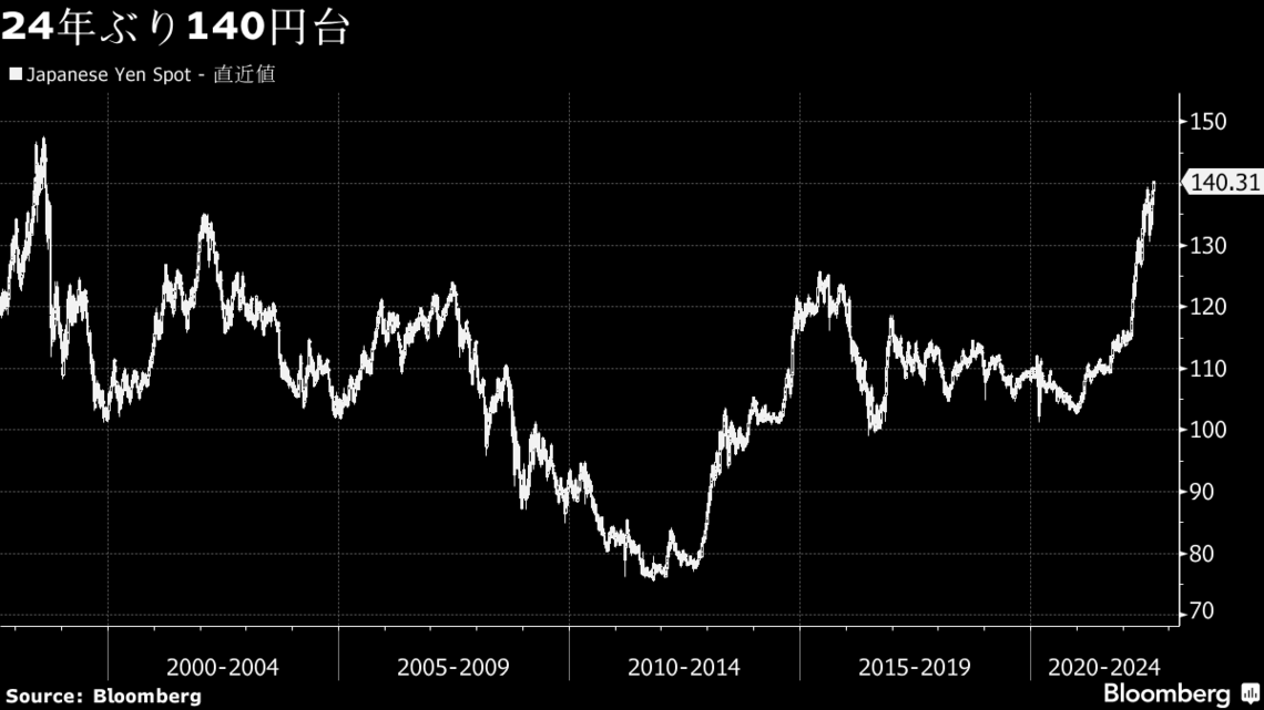 東京外国為替市場では円が対ドルで一時1ドル=140円半ばまで下落し、24年ぶり安値を更新した。堅調な米経…