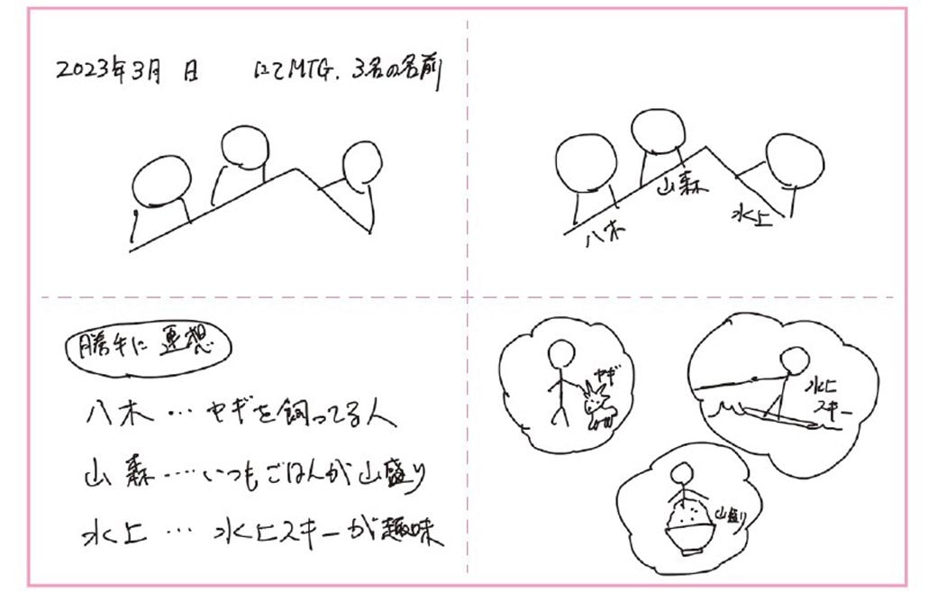記事に戻る 挨拶で「顔と名前が覚えられない」防ぐ簡単解消法 記憶プロ直伝「興味ない事」ずっと忘れないコツの写真一覧 「瞬時に覚えて忘れない名前の記憶法」を紹介します(写真:Jake Images/PIXTA) 1/2 下に画像が続きます 名前から連想したもので感情を動かすと、記憶しやすくなる。「水上」さんだったら、「水上スキーが趣味の人」というイメージをつくり、「楽しそう」という感覚と一緒に頭に入れる。「八木さん」だったら、「ヤギを飼っている人」。「山森さん」なら「いつもごはんが山盛りの人」。突拍子のないイメージのほうが、脳に強烈なインパクトを与え、記憶が定着しやすくなる(イラスト『A4・1枚記憶法』より) 2/2
