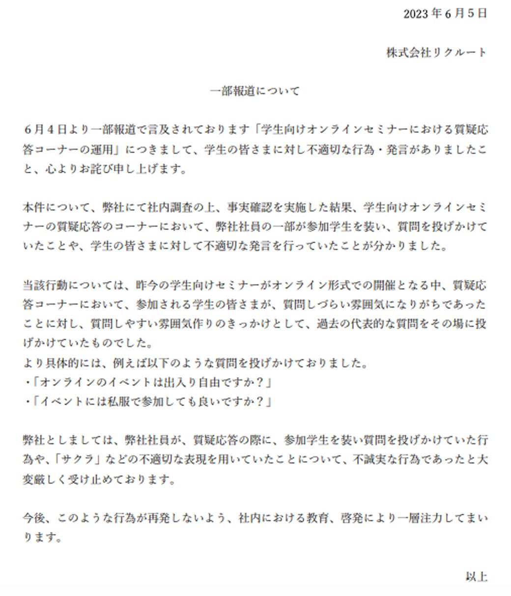 記事に戻る リクナビ「サクラ行為」の謝罪が不誠実すぎる理由 問題をうまく矮小化し、「動物園」表現には触れずの写真一覧 「悪い意味でうまい」リクルートの謝罪。「問題矮小化」とも言えるテクニックを、企業PR戦略の専門家・下矢一良氏が解き明かしていきます(画像:リクナビ公式Webサイト) 1/4 下に画像が続きます リクルートは2日後に謝罪文を発表。だが、「動物園」表現の真相などに言及はなく、また責任者の名前の記載もない、非常に簡潔な内容だった(画像:リクナビ公式Webサイト) 2/4