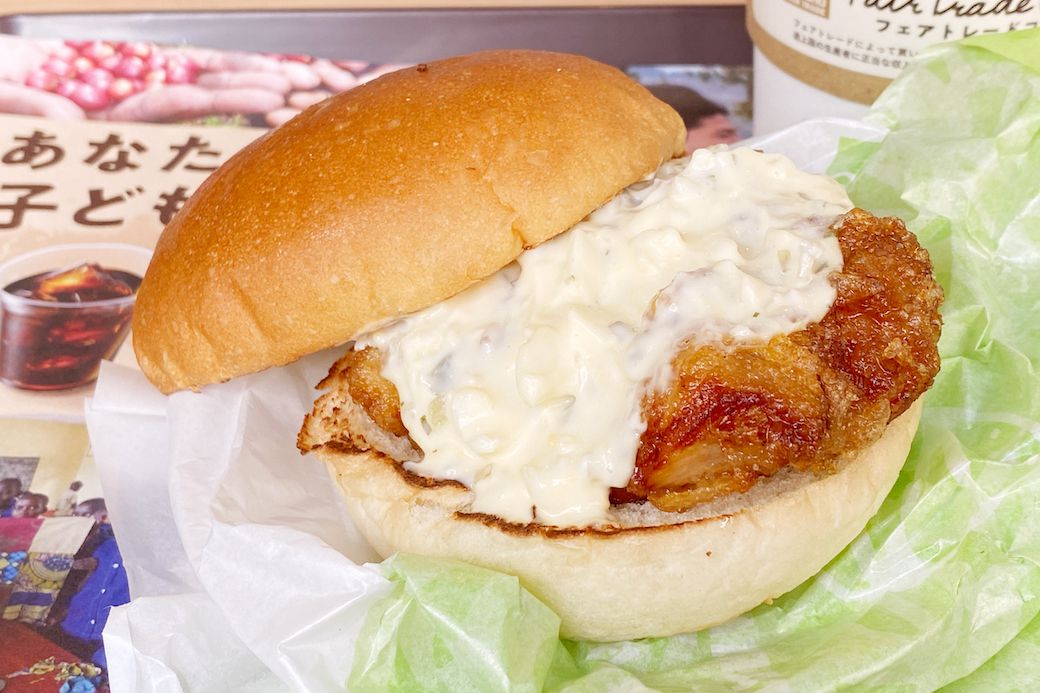 ツヤツヤピカピカのバンズで、薄い衣のチキンパティとタルタルをサンド(筆者撮影)