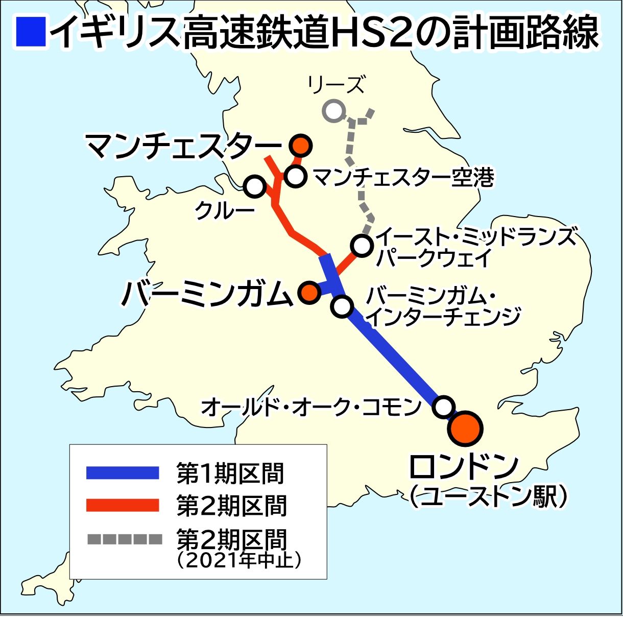 記事に戻る イギリス高速鉄道「未着工区間は中止」の衝撃 コスト増など理由、沿線からは失望と怒りの声の写真一覧 イギリスで建設中の高速鉄道「HS2」の車両と駅のイメージ(画像:© High Speed Two Ltd) 1/8 下に画像が続きます イギリス高速鉄道HS2の計画路線。今回スナク首相が中止を発表したのは第2期区間だ(編集部作成) 2/8