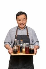 安部司は15年かけて「魔法の調味料」を開発した。左奥が「甘酢」、中央手前が「たまねぎ酢」(撮影:佳川奈央/以下同)