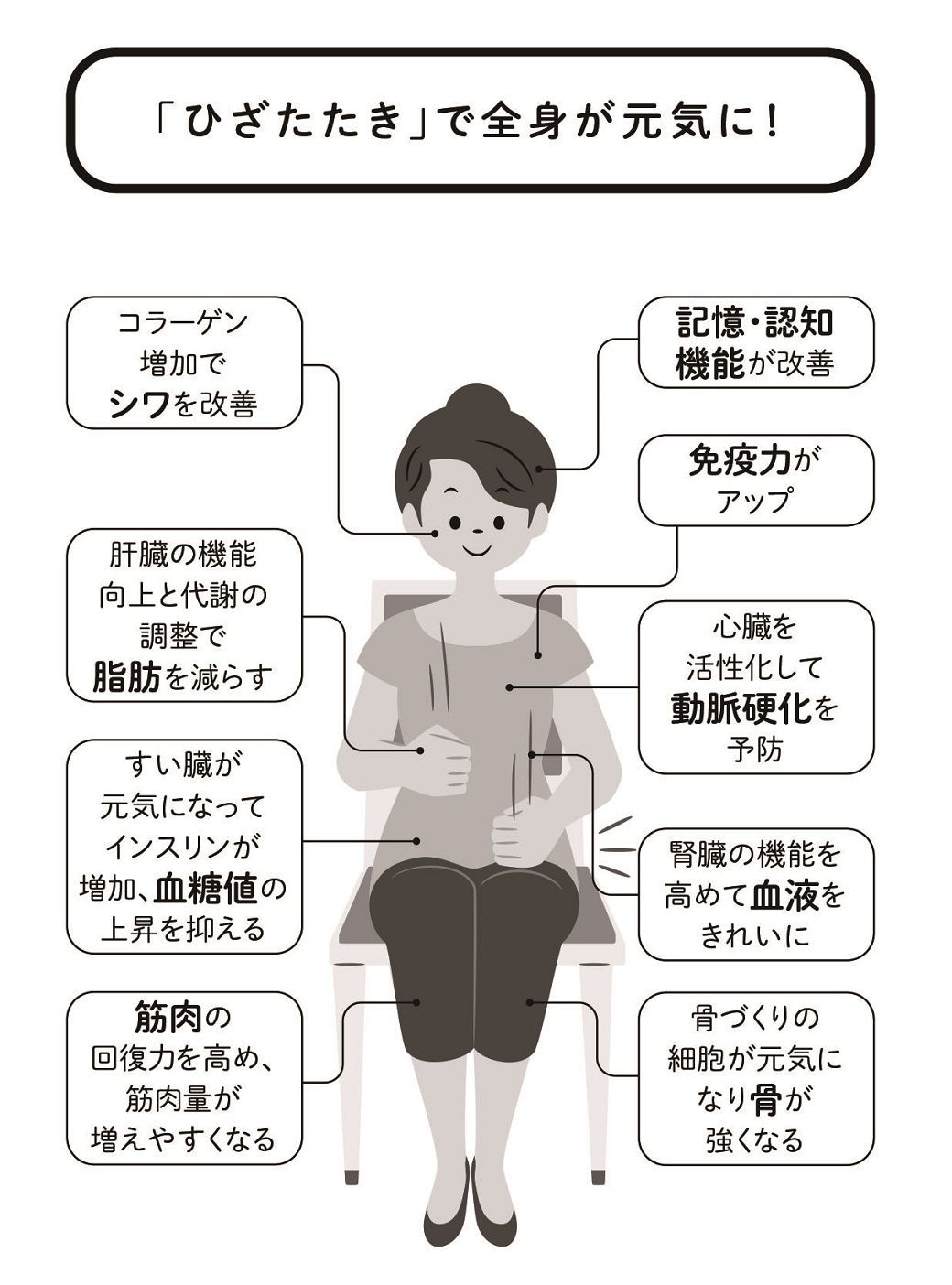 記事に戻る 「膝をたたくだけ」医師が勧める簡単すぎる健康法 最近注目の「若返りホルモン」が期待できるの写真一覧 今までにないくらいかんたんで、圧倒的に続けやすい「ひざたたき」健康法をご紹介します(写真:kuro/PIXTA) 1/3 下に画像が続きます (『ひざたたき 世界一かんたんな健康法』より) 2/3