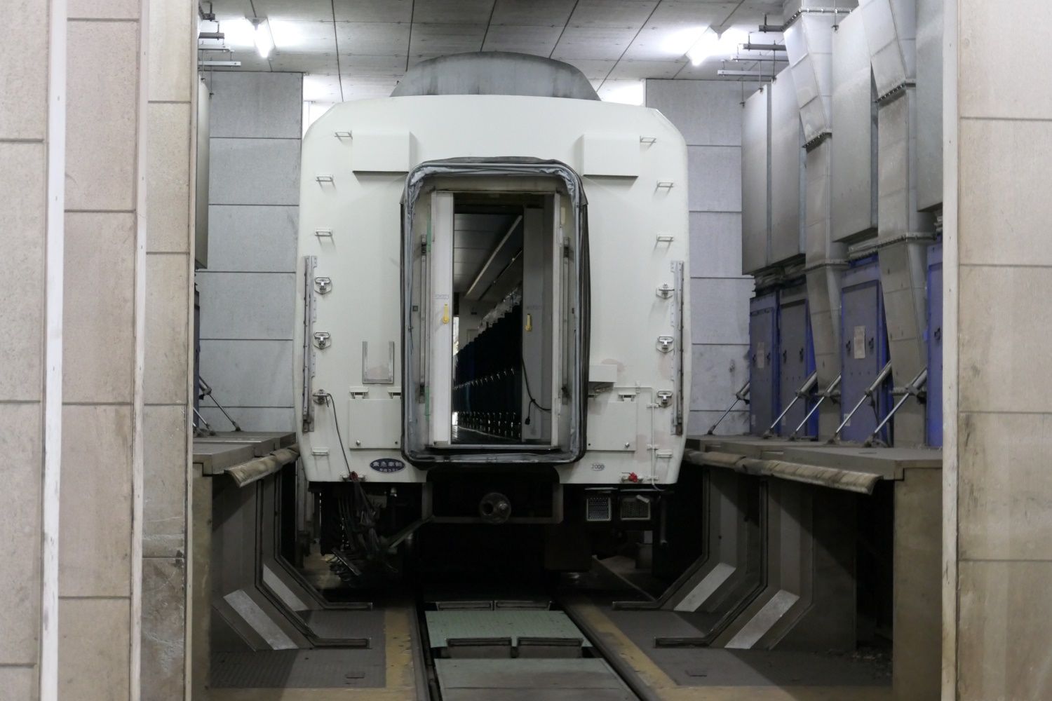 記事に戻る 東武100系「元祖スペーシア」知られざる整備現場 部品外してメンテナンス、出場時「いちご色」にの写真一覧 下に画像が続きます ホコリやゴミを時速252kmの風で吹き飛ばす(記者撮影) 18/90