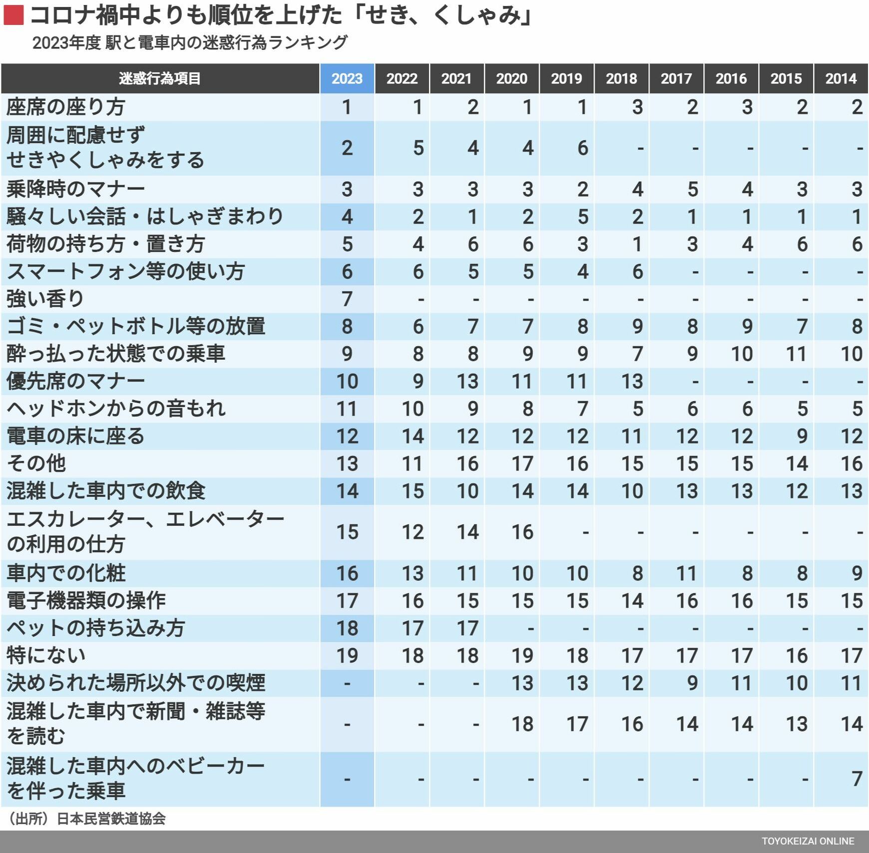 電車内での迷惑行為ランキング「周囲に配慮せずせきやくしゃみ」はコロナ5類移行後の2023年度は何位になった?(写真:Ushico/PIXTA)