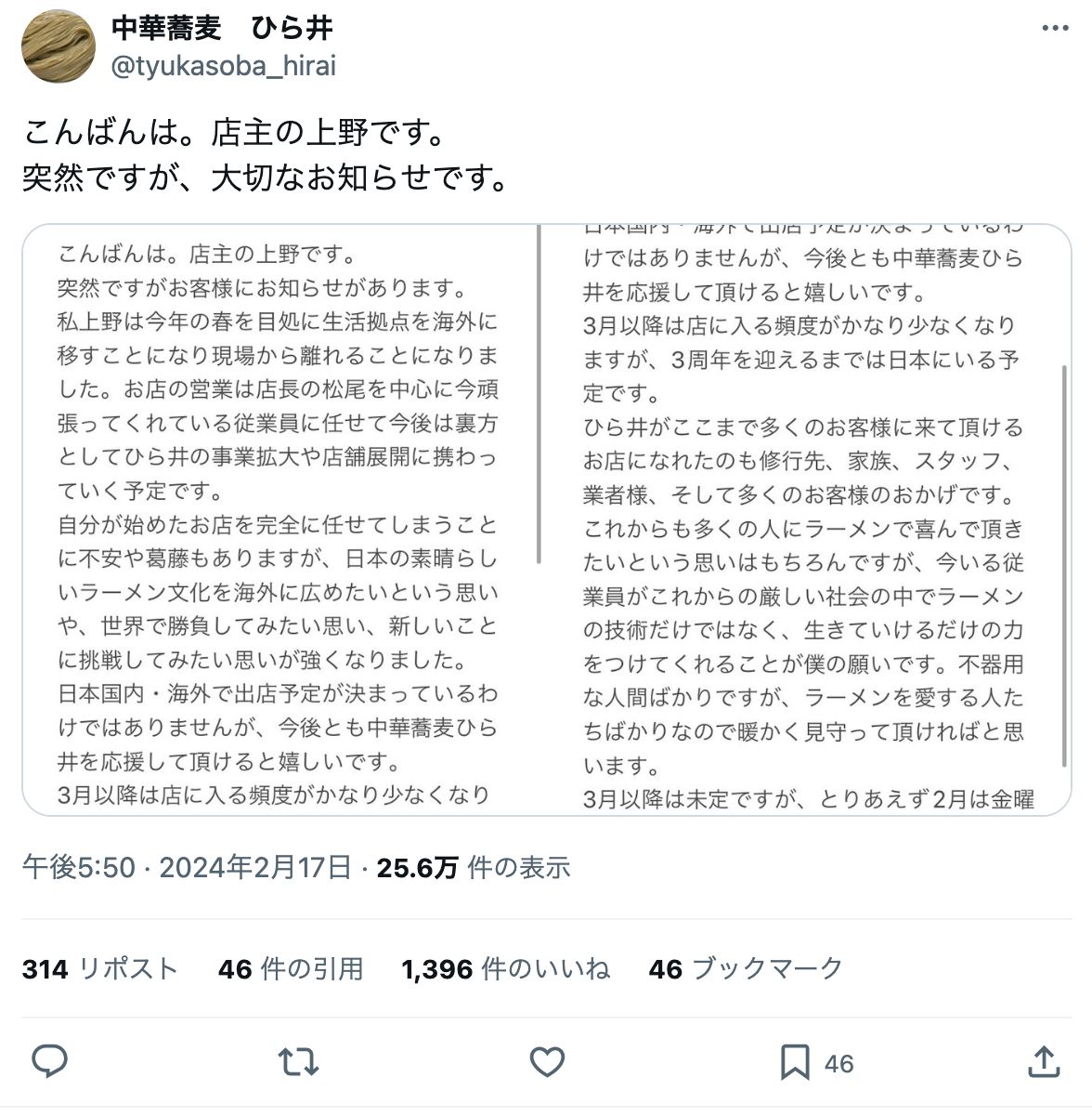 (2024年2月17日/@tyukasoba_hirai/中華蕎麦 ひら井)