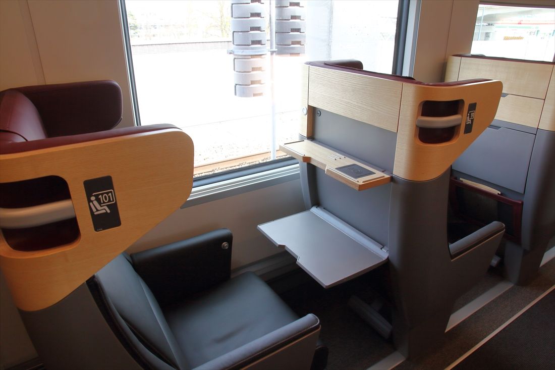 1等車の座席。テーブルは上下2段式(撮影:橋爪智之)