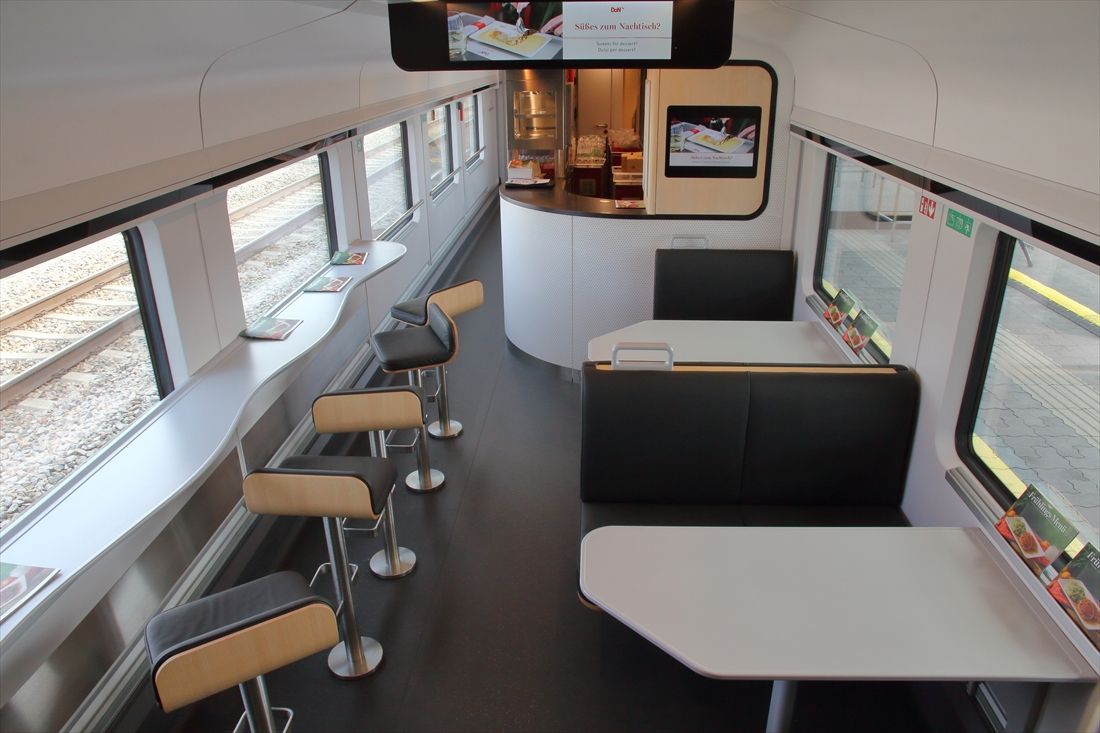 記事に戻る オーストリア鉄道「新型レイルジェット」の大進化 特急車両も「低床化」でバリアフリーを徹底の写真一覧 下に画像が続きます 食堂車はテーブル席のほかにカウンター席もある(撮影:橋爪智之) 32/51