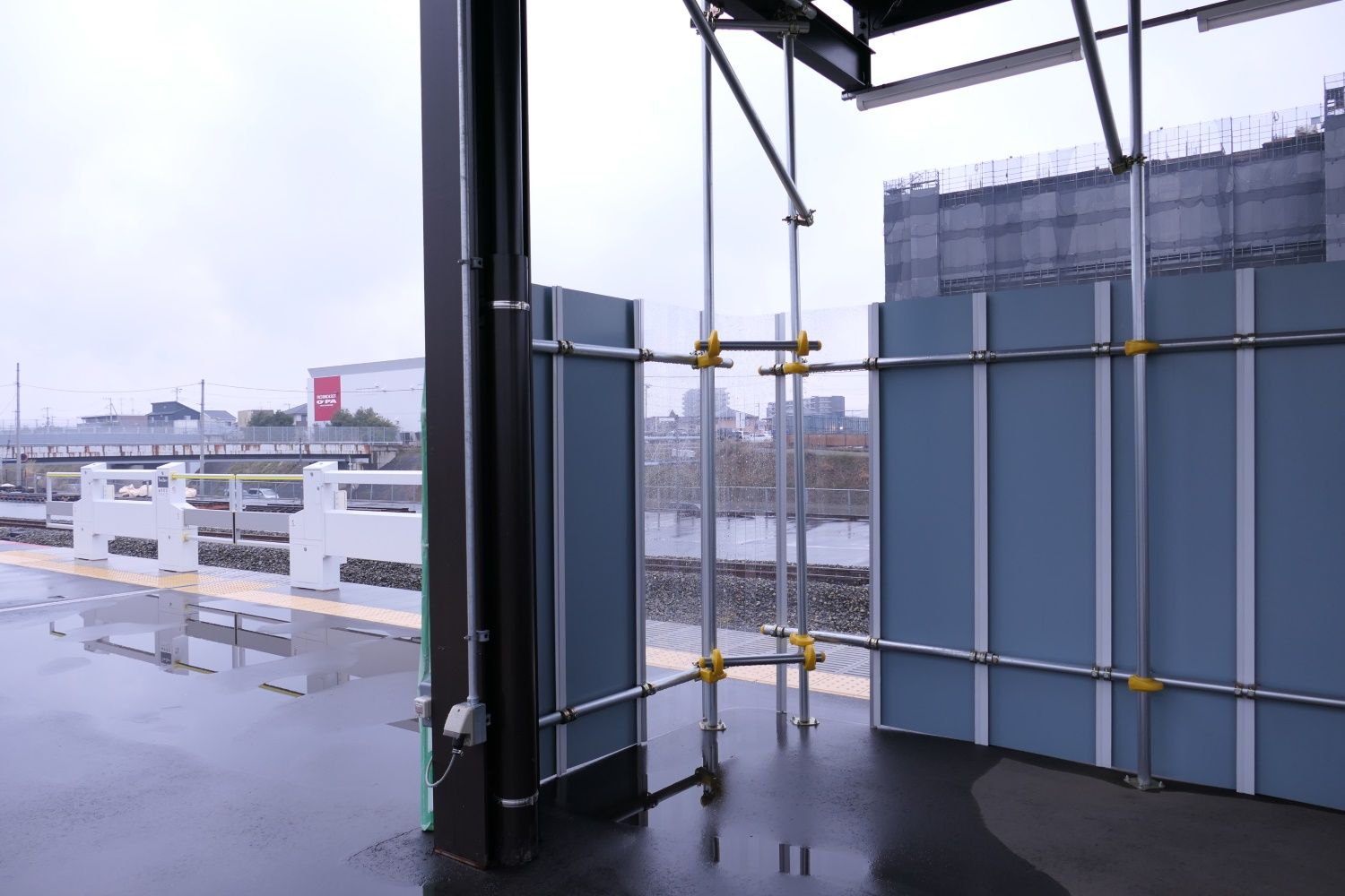 ホーム上の工事の仮囲いや……(記者撮影)