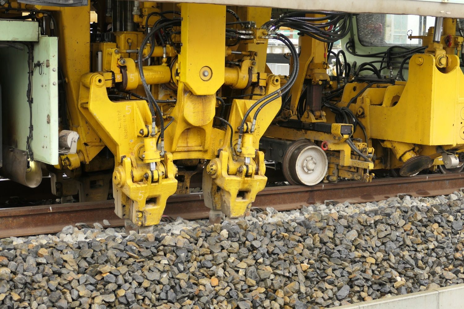 ツメを差し込んで振動でバラストをつき固める(記者撮影)