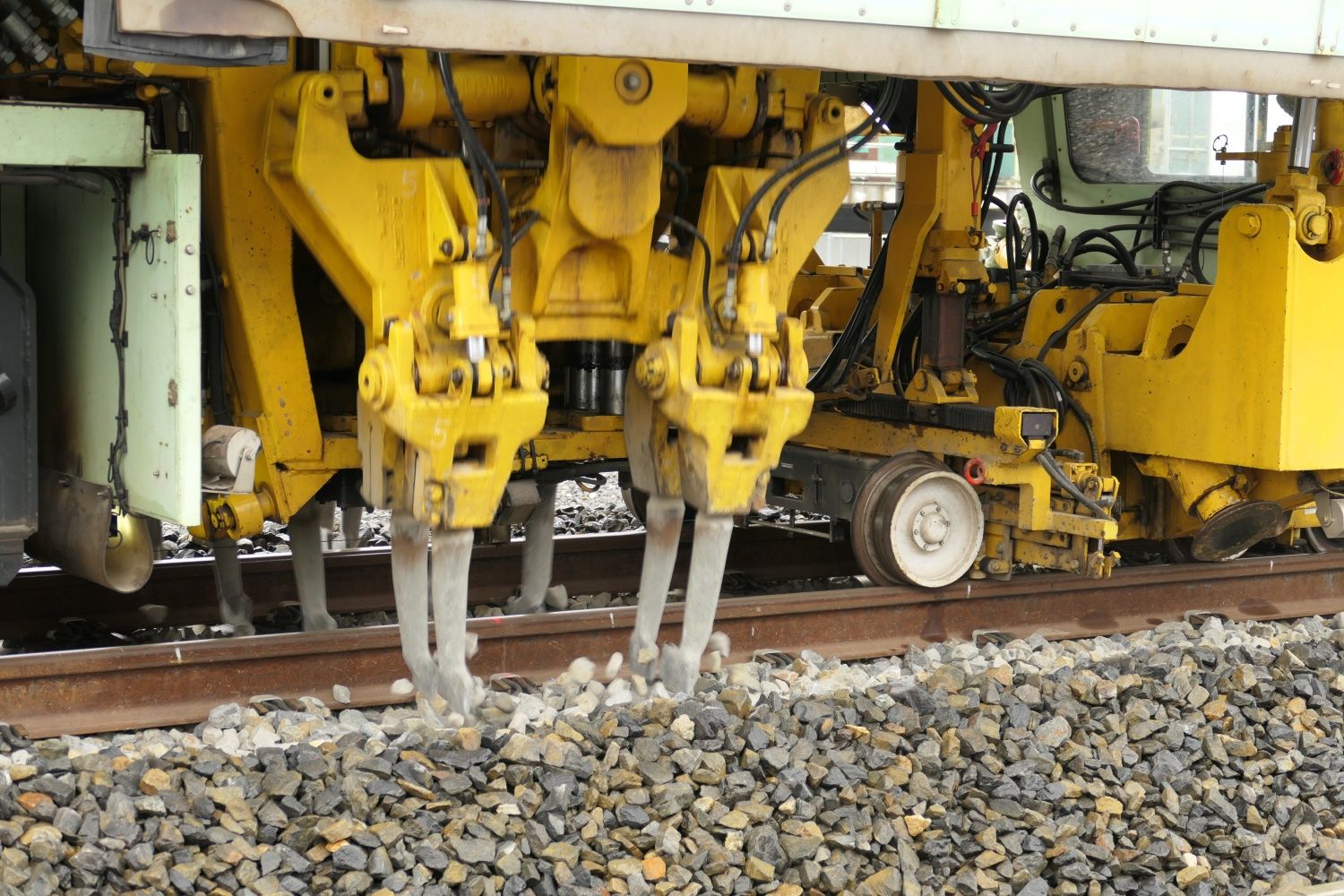ツメを差し込んで振動でバラストをつき固める(記者撮影)