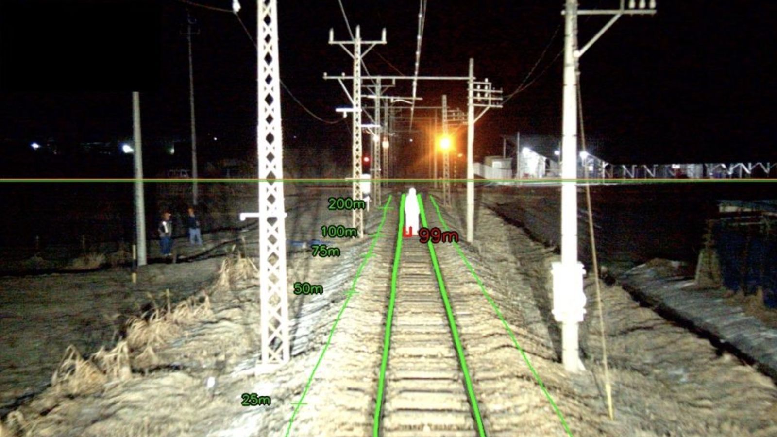 東芝インフラシステムズが長野電鉄の一部区間で実施している自動運転システムの実証実験。夜間の支障物検知試験の様子(写真提供:東芝インフラシステムズ)