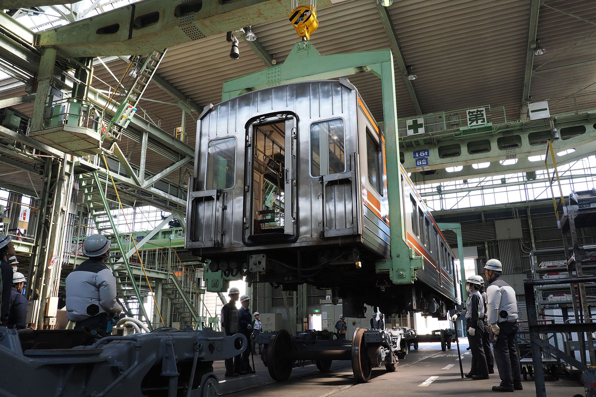 記事に戻る 大阪メトロ堺筋線「飛び地」にある車両基地の内側 阪急沿線、東吹田検車場ならではの作業とは?の写真一覧 下に画像が続きます クレーンで車体を吊り上げて台車上に下ろす「架台下ろし」(撮影:伊原薫) 5/30
