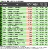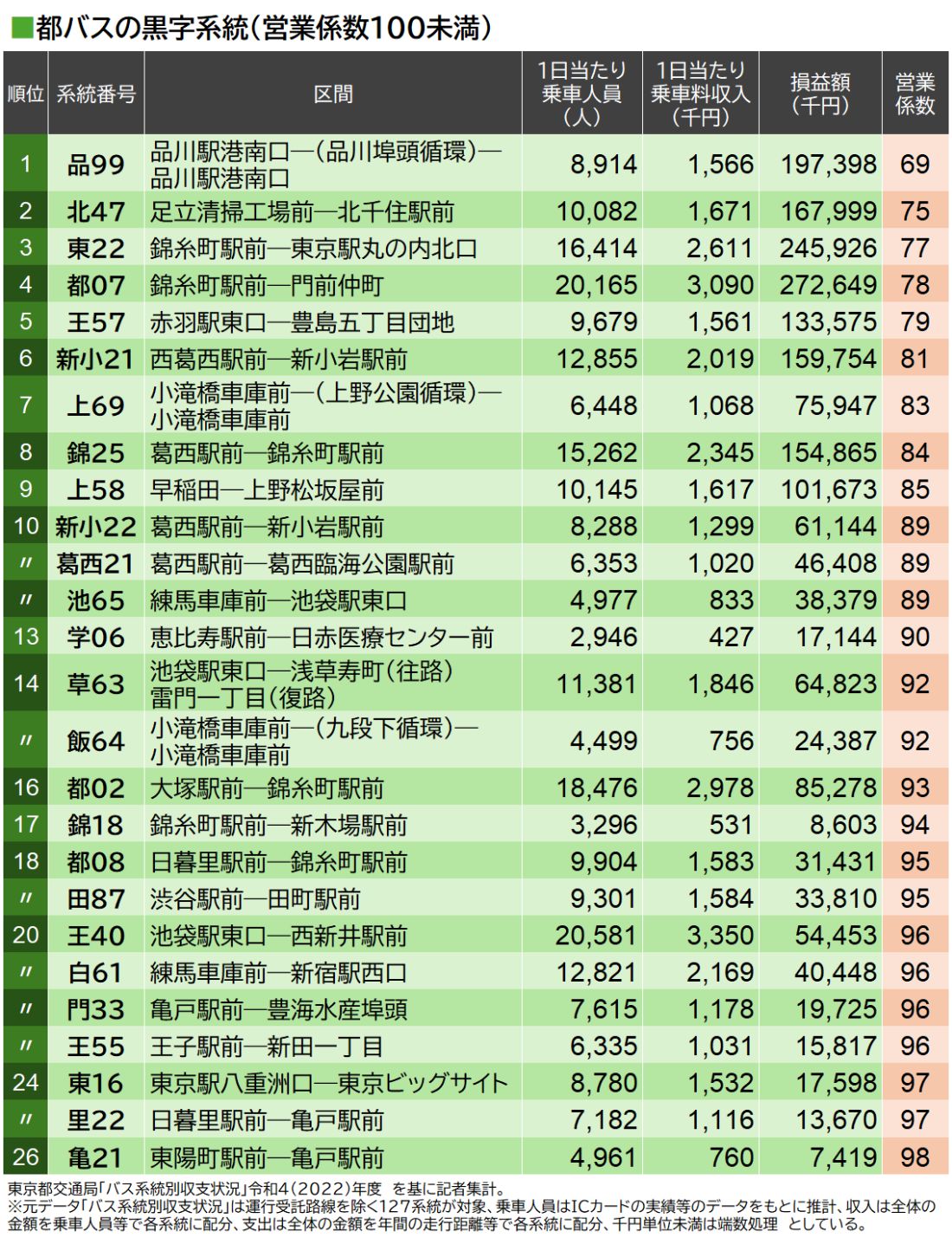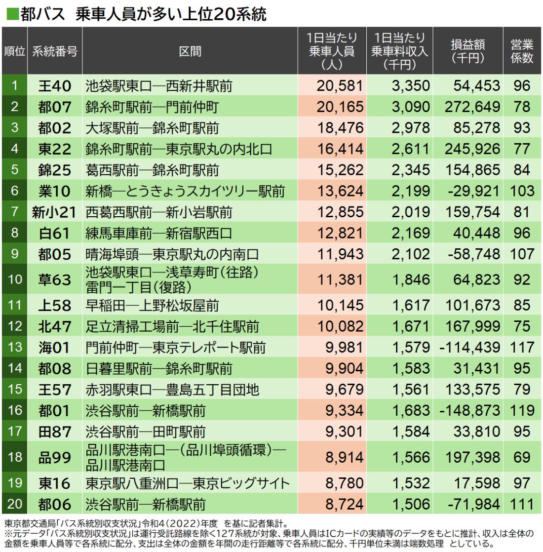 記事に戻る 誕生100年の都バス「利用者多い路線」はどこ? 鉄道網の空白地帯が健闘、でも実は8割が赤字の写真一覧 乗車人員が多い都バスの上位20系統(東京都交通局公表データを基に記者集計・作図) 1/18 下に画像が続きます 都バスの黒字系統。8割の路線が赤字でこれらの路線が運営を支える(東京都交通局公表データを基に記者集計・作図) 2/18