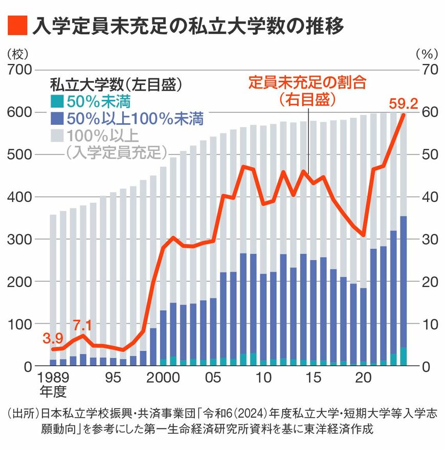 少子化の影響で私立大学の約6割が定員割れを起こし、大学淘汰時代が到来しています。大都市圏でも学生確保が難化する中、今後は大学の経営破綻が現実味を帯びてきました。万が一、在学生はどう守られるのか――今求められる支援策を考察します。