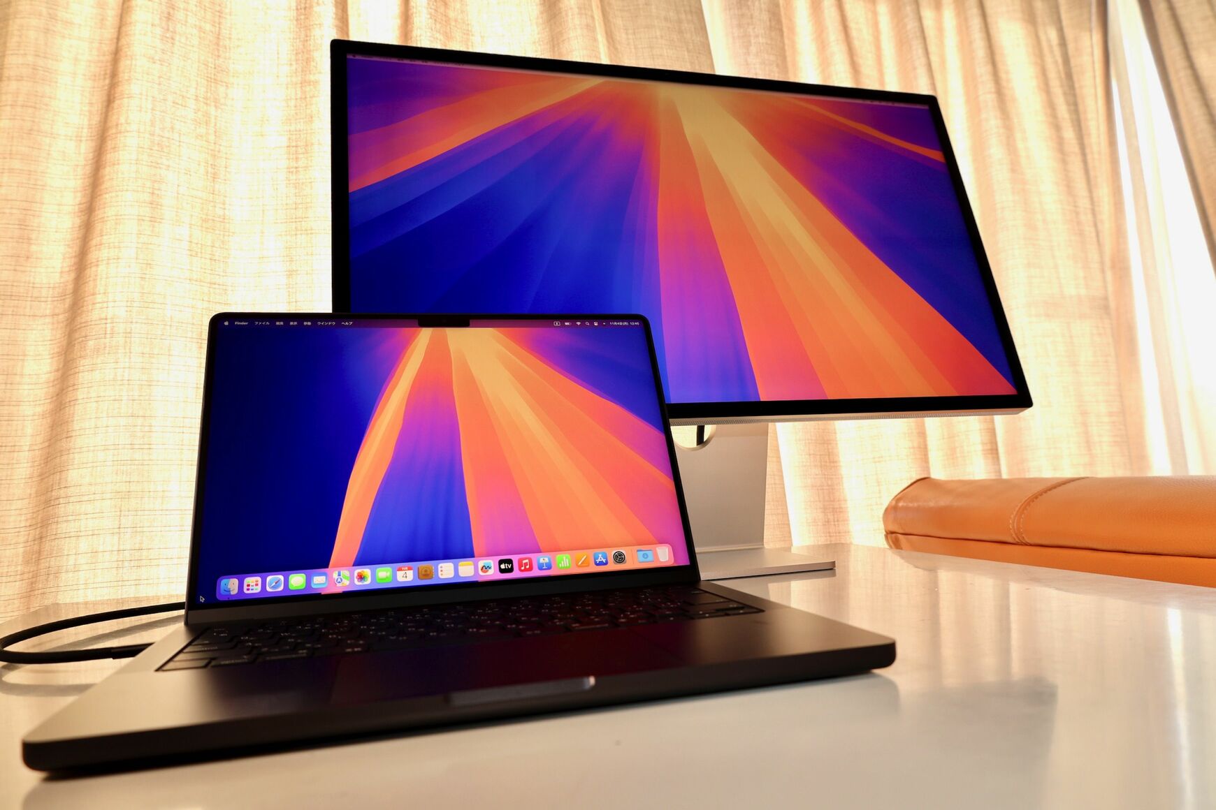 5KのStudio Displayを接続してみた。本機はこれより大きな6Kのディスプレイを2台まで接続することができる(筆者撮影)