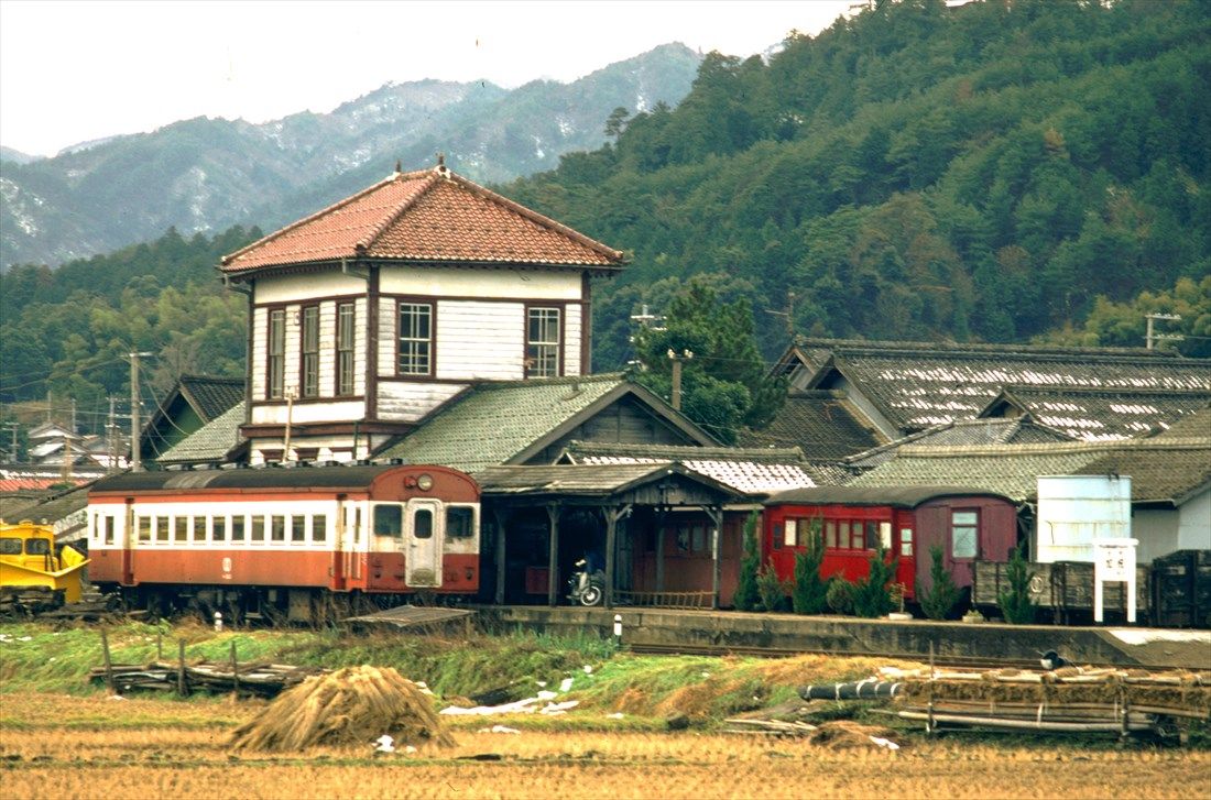 加悦駅の駅舎とキハ08(撮影:南正時)