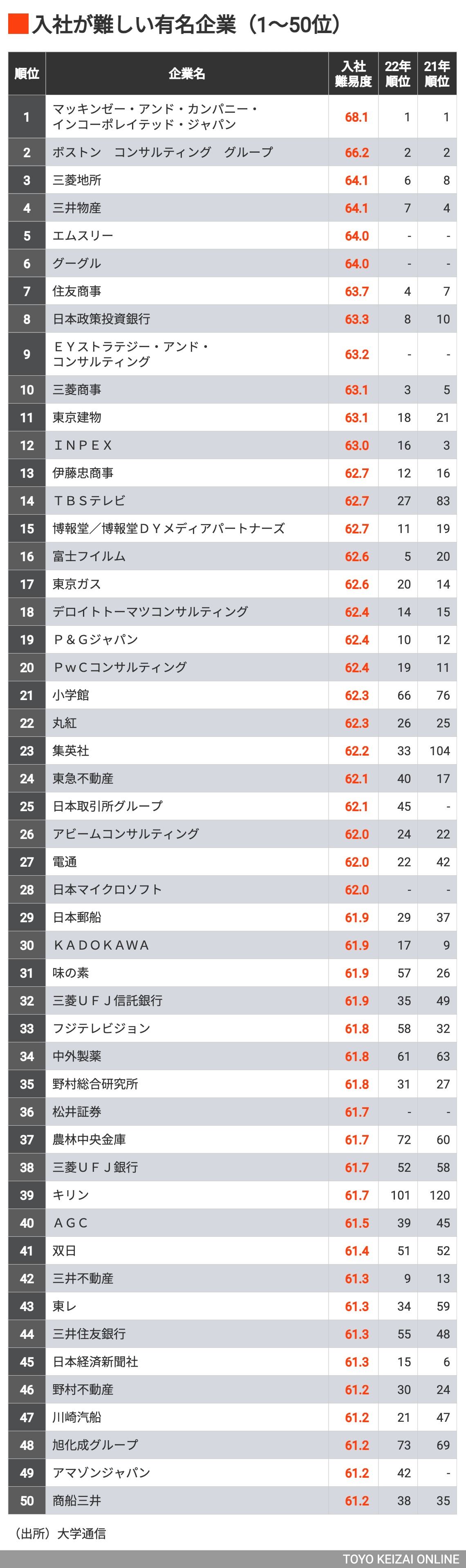 「入社が難しい有名企業ランキング」トップ200社【再配信】 大手商社や不動産が外資コンサルに押され気味の写真一覧
