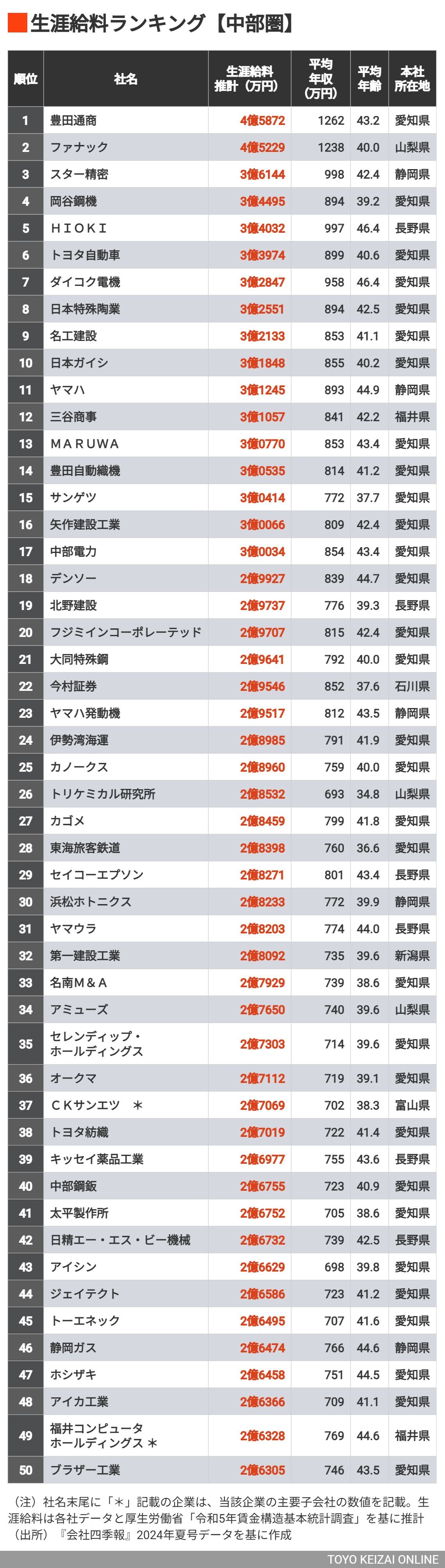 新卒入社から定年退職まで得られる「生涯給料」。今回は、新潟・富山・石川・福井・山梨・長野・岐阜・静岡・愛知の中部9県に本社を置く企業390社を対象に、最新ランキングをお届けします。トップ企業の顔ぶれや、3億円超えの高給企業とは?気になる中部の賃金事情を徹底解説します。