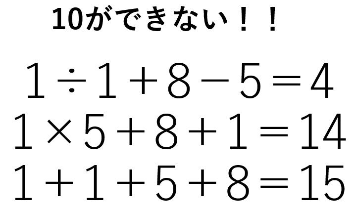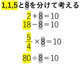 東大生が大絶賛!頭が良くなる「メイク10」に挑戦 四則演算で「1,1,5,8」を「10」にできますか?の写真一覧