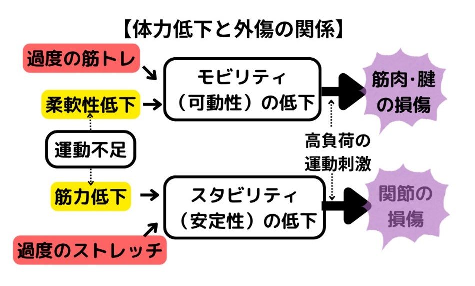体力低下も過度のトレーニングもケガの原因となる(図:筆者作成)