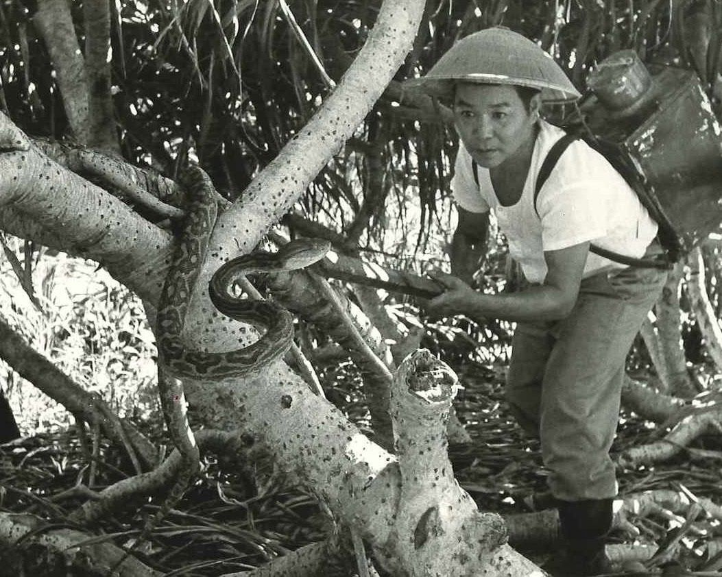 記事に戻る 「奄美にあるハブ屋」が3世代に渡って続く背景 時流読み変化続けるハブ屋のビジネス(前編)の写真一覧 下に画像が続きます 1969年ごろの原宮哉さん。原ハブ屋創業前はハブ毒採取所の採取人として働いていたこともある(写真:原ハブ屋提供) 3/4
