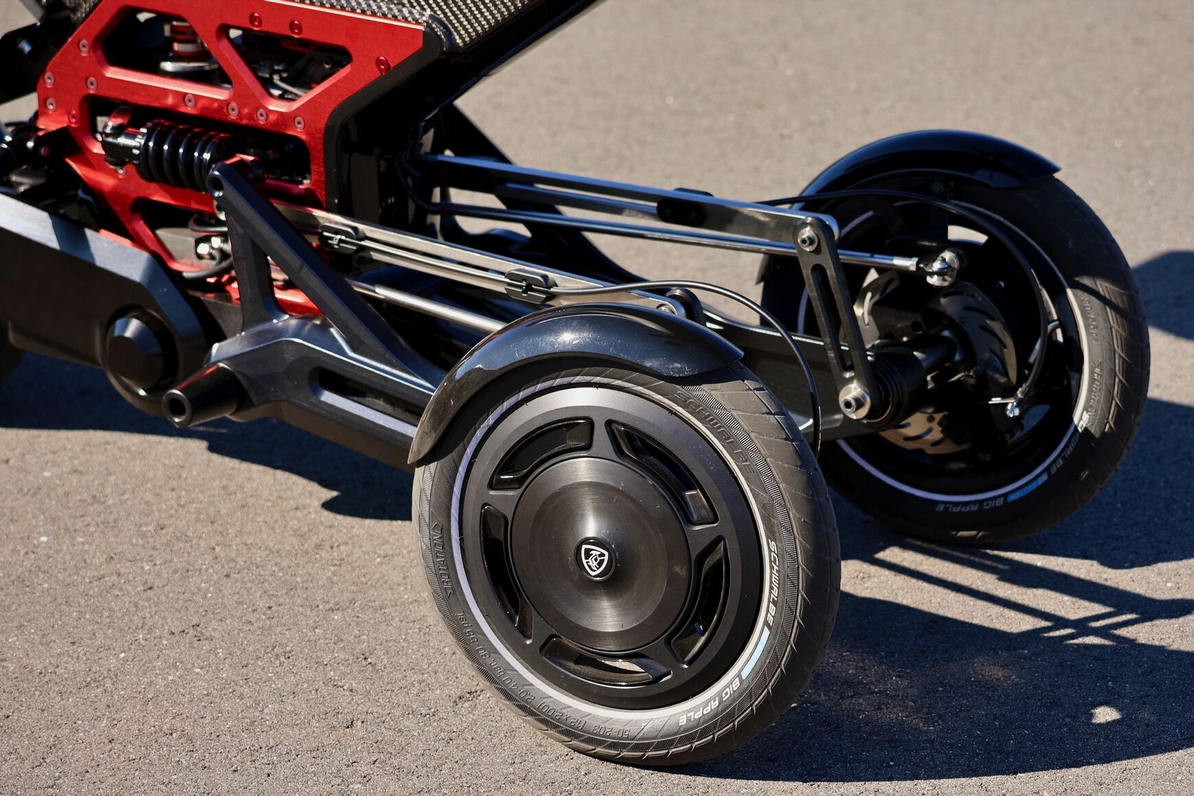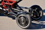 Raptorは前2輪。リーンも可能で、ステリングの動きはリンケージロッドでハブ部分に伝えられる。左右の車輪は差動で上下し、サスペンションは個別にストロークする(著者撮影)