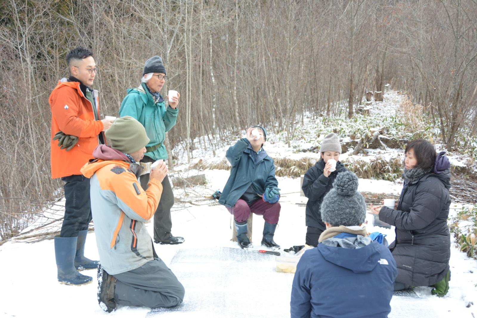 記事に戻る 「死ぬのが楽しみに」ふるさと難民が森で得た希望 岩手「いのちを還す森」 埋葬予定の森を手入れの写真一覧 下に画像が続きます 作業のあいまにお茶を飲み交流する。この時間を楽しみに参加する人も(写真:筆者撮影) 3/12