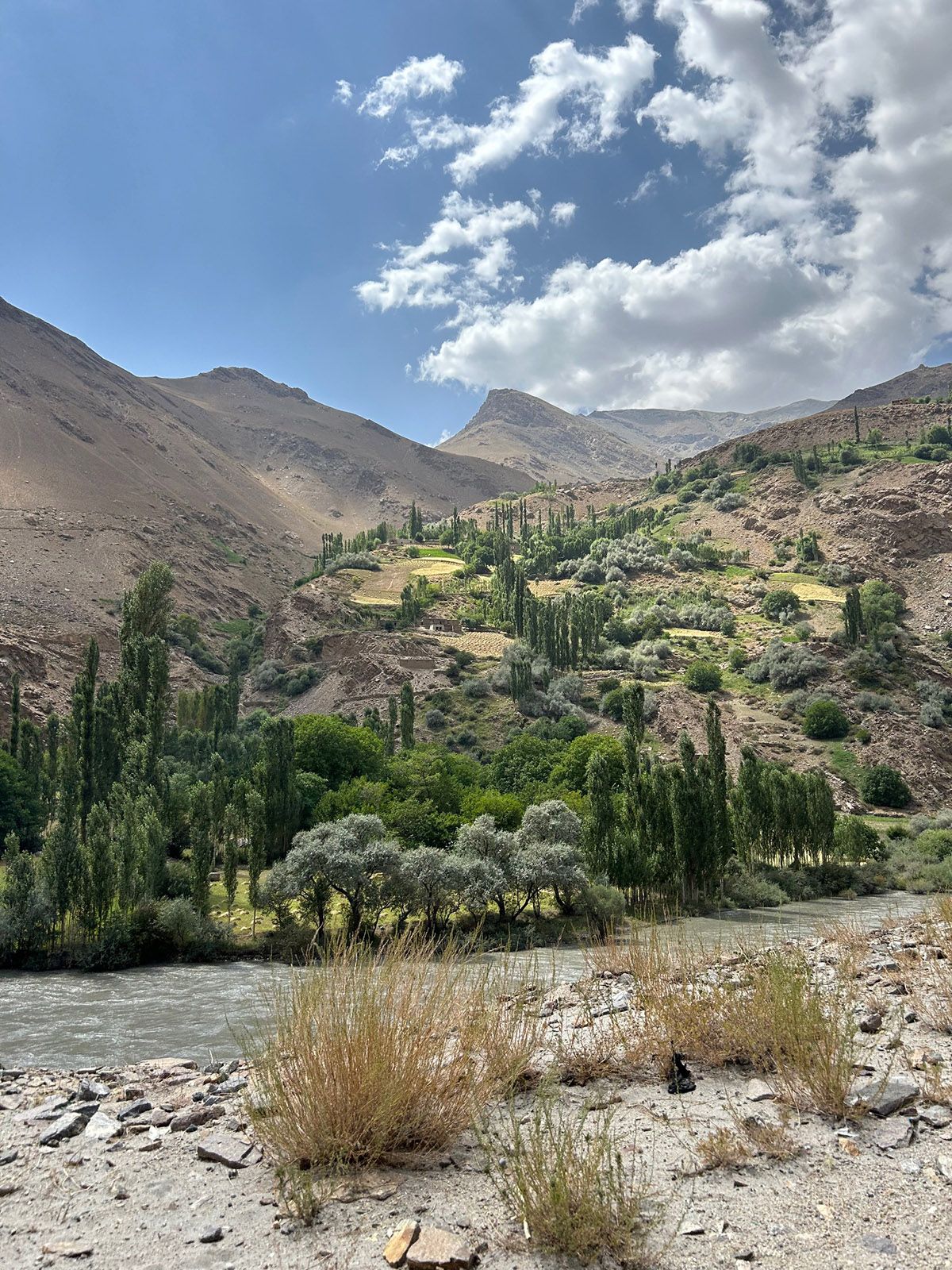対岸のアフガニスタンは手が届きそうなほど近いが、タジキスタンとの経済的な格差はみてとれる。急傾斜地での開拓はタジクよりもアフガンにより強い執念を感じた(写真:筆者撮影)