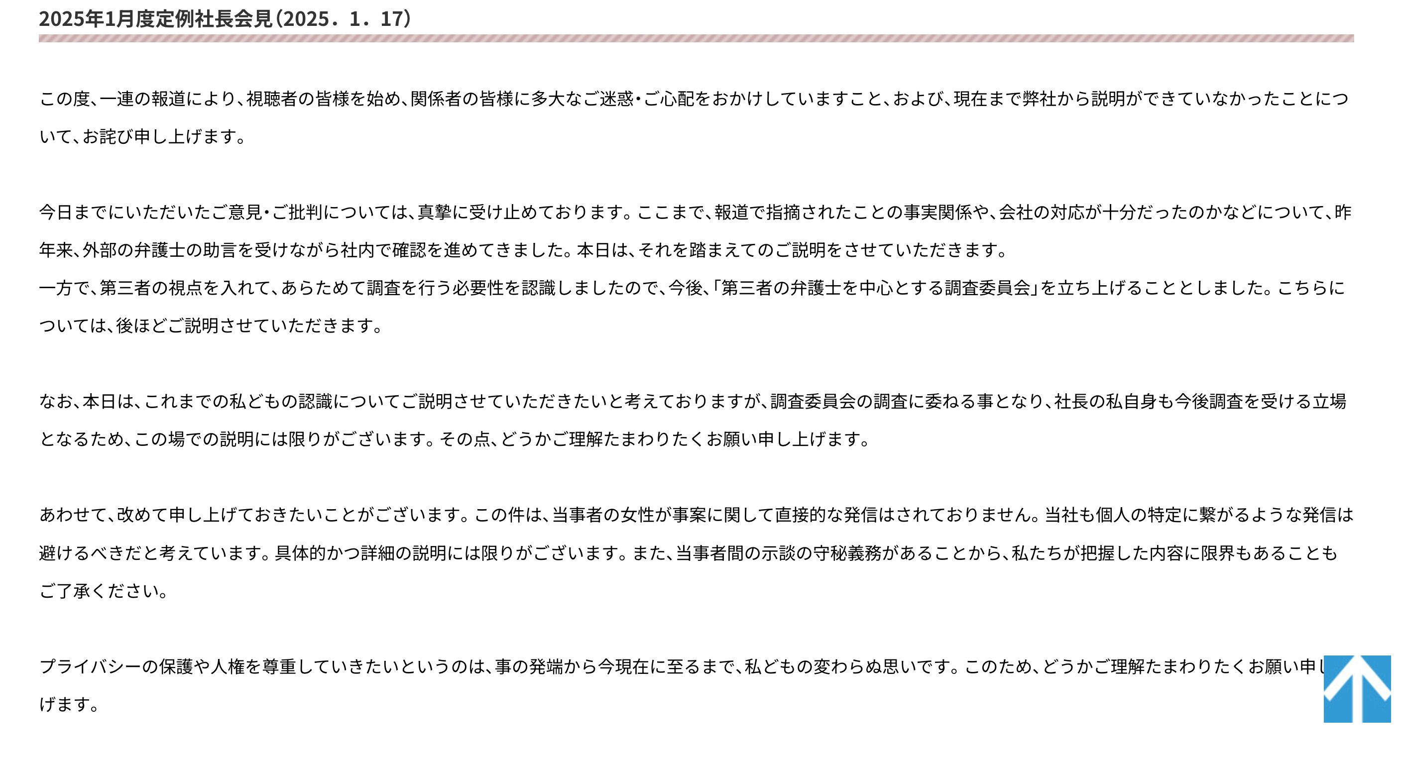 コーポレートサイトに、「2025年1月度定例社長会見」として会見時の港社長のコメントが掲載された(画像:フジテレビ公式サイトより)