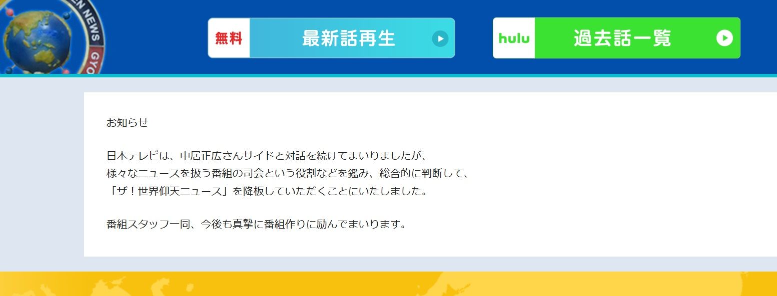 記事に戻る フジCM出稿停止「企業の判断」が間違ってない理由 懸念のあるメディアへの出稿はリスクでしかないの写真一覧 下に画像が続きます 続々と番組の降板、出演休止が発表されている中居氏。「ザ!世界仰天ニュース」は長年司会をしていた同番組だったが、わずか5行の文章で降板が発表された/出所:「ザ!世界仰天ニュース」公式サイト 5/6