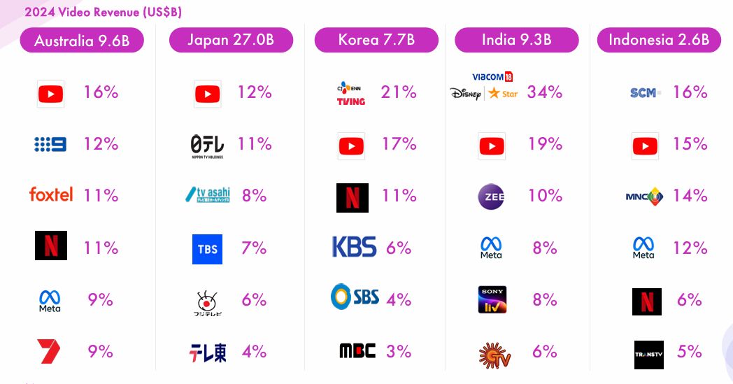 メディア・パートナーズ・アジアが調査したアジア主要国別の2024年動画市場規模。オーストラリア、日本、韓国、インド、インドネシア各国の事業者シェアランキングを示す(画像:メディア・パートナーズ・アジアの資料より)