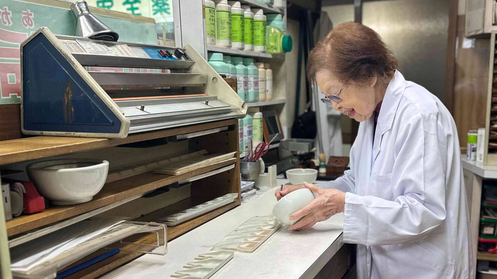 記事に戻る 「102歳の薬剤師」今も"週6勤務"を続ける深い理由 夫の事業失敗、30歳で開業…予定外でも幸せな人生の写真一覧 下に画像が続きます 長い間使い続けてきた調剤道具を今も大切にしている(東洋経済オンライン編集部撮影) 8/11