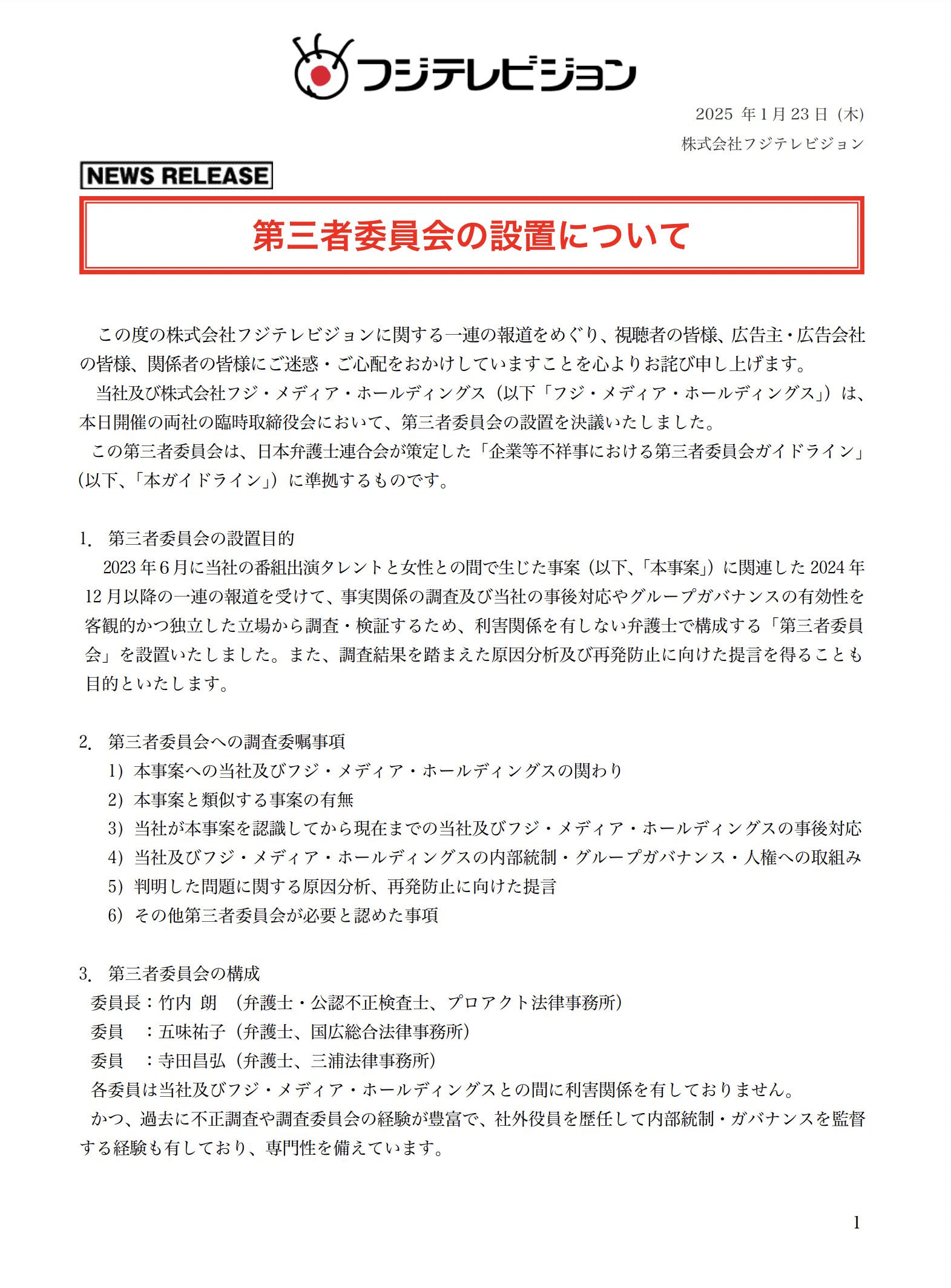 記事に戻る 「フジはヤバい」と追求する側にも潜む"リスク" "性接待"は本当にフジテレビだけの問題なのかの写真一覧 下に画像が続きます フジテレビと株式会社フジ・メディア・ホールディングスが1月23日に開催した臨時取締役会において、第三者委員会の設置を決議したことを発表(画像:フジテレビ公式サイトより) 3/4