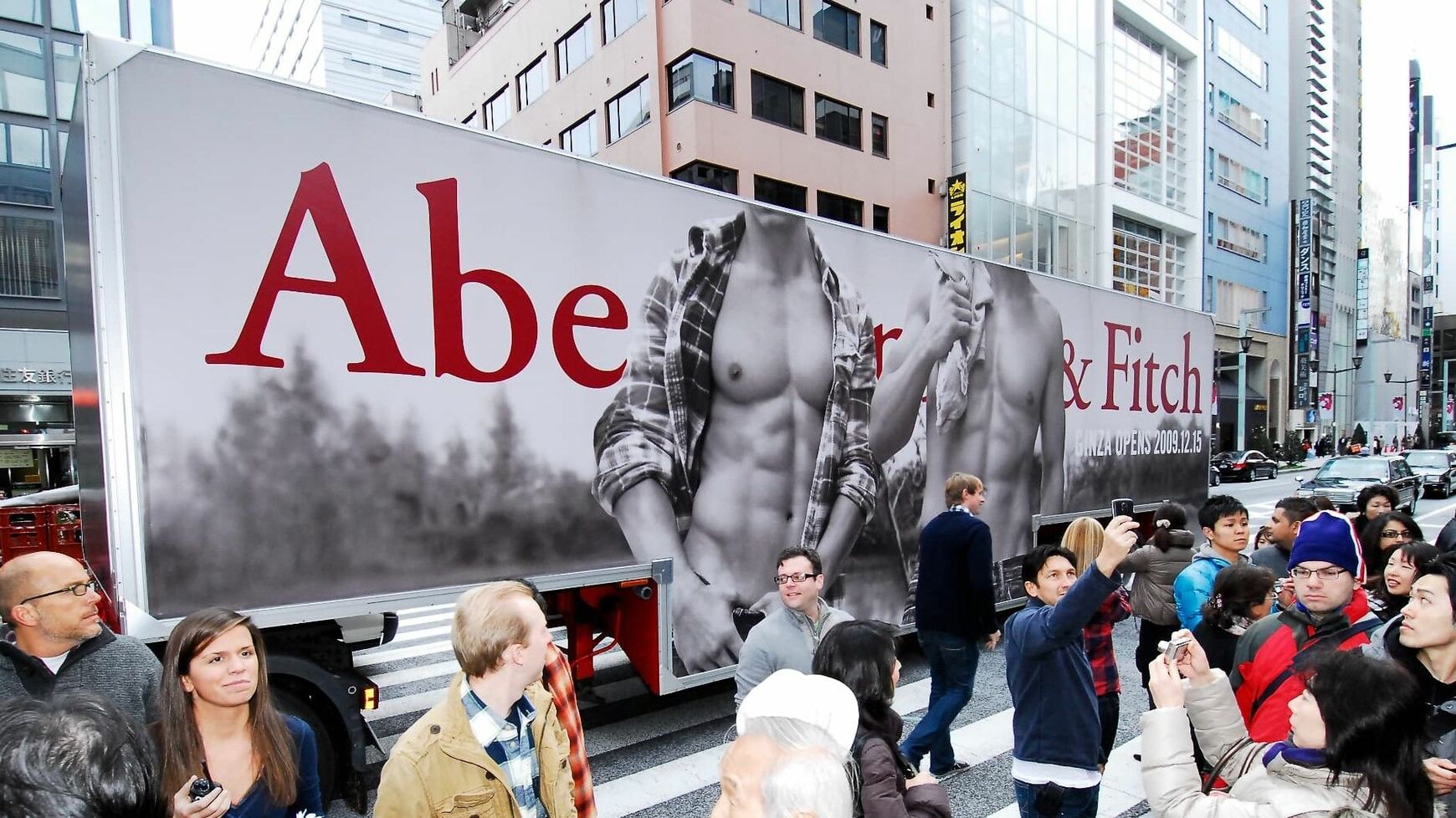 記事に戻る よみがえったアバクロ、「5年で利益10倍」の復活劇 「全米で最も嫌われたブランド」をどう抜け出した?の写真一覧 2009年、日本初上陸のアバクロ銀座店。マッチョなアピールがなされていた(撮影:梅谷秀司) 1/4 下に画像が続きます 2/4