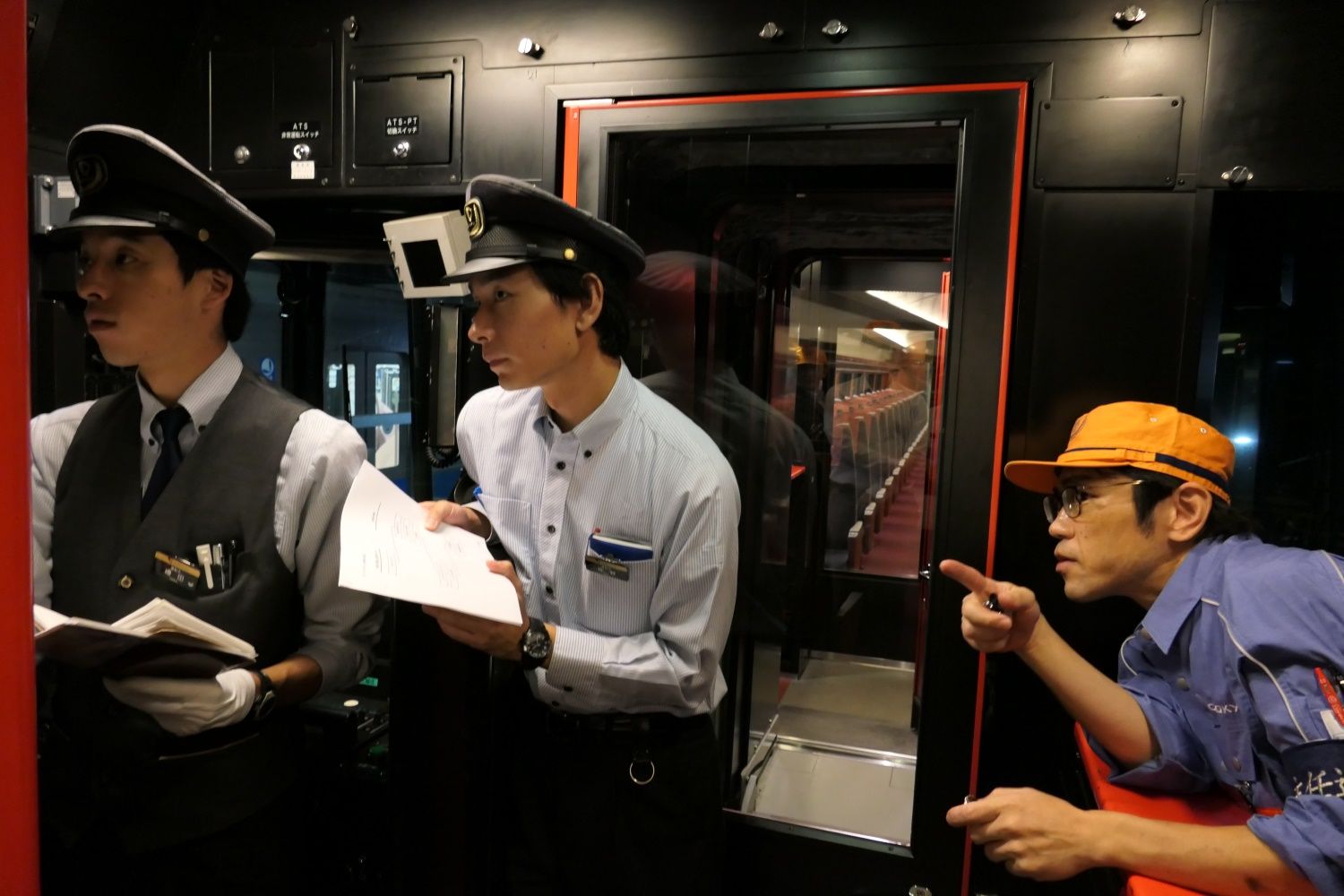乗務員室内の機器の配置や扱い方を学ぶ(記者撮影)