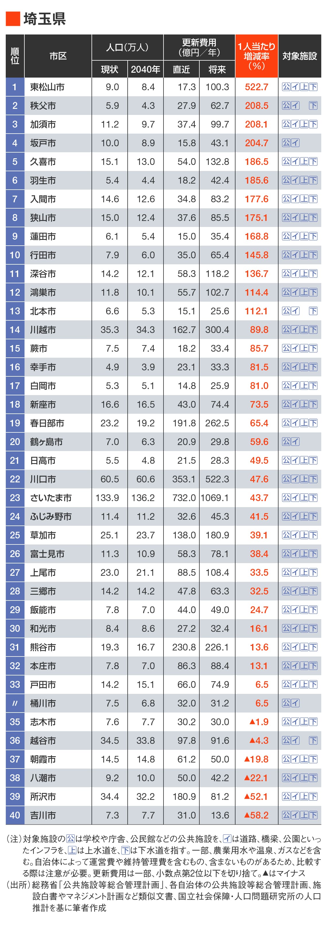 「インフラ更新が心配」な街ランキング・南関東編 更新費用が2倍以上に膨らむ自治体は全体の4割の写真一覧