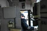 19両の貨車を牽引するDF200形を操るJR貨物の長谷川良太運転士(記者撮影)
