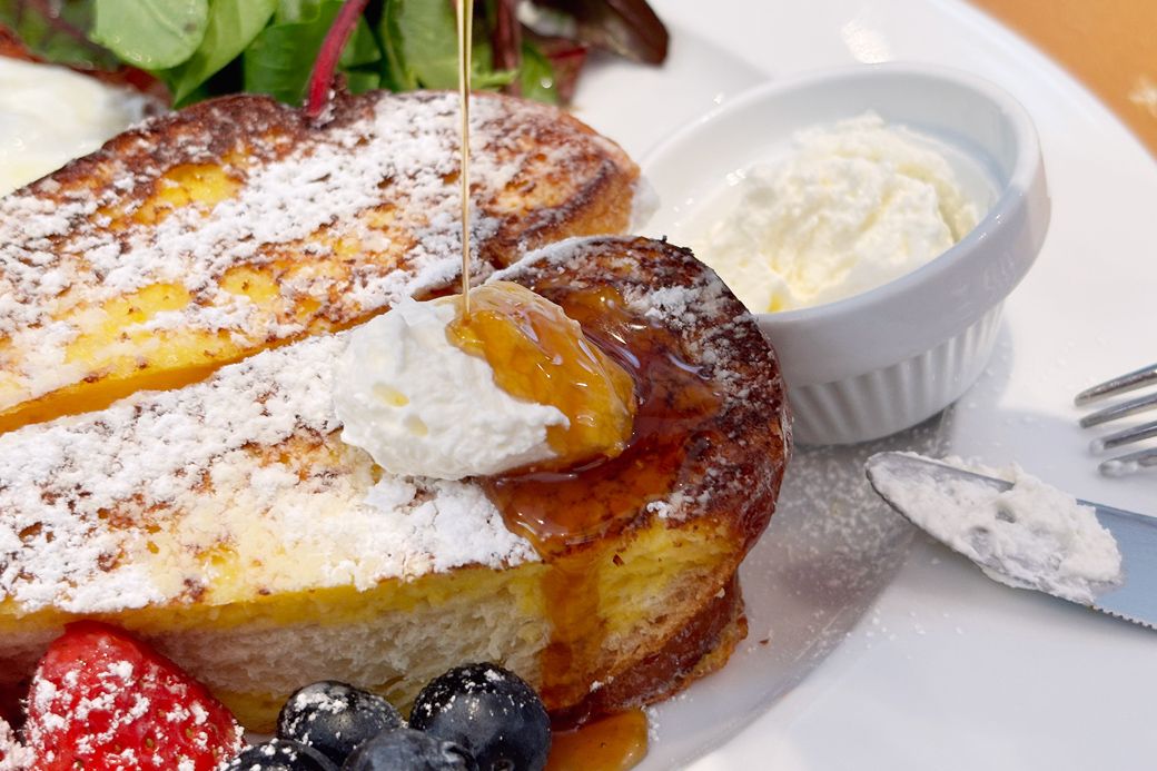 厚切りバケットのフレンチトーストに、たっぷりメープルシロップをかけていただきます(筆者撮影)