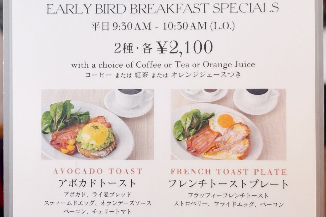 ドリンク付きのお得なARLY BIRD BREAKFAST SPECIALS(早起き朝食スペシャル)は2100円(筆者撮影)