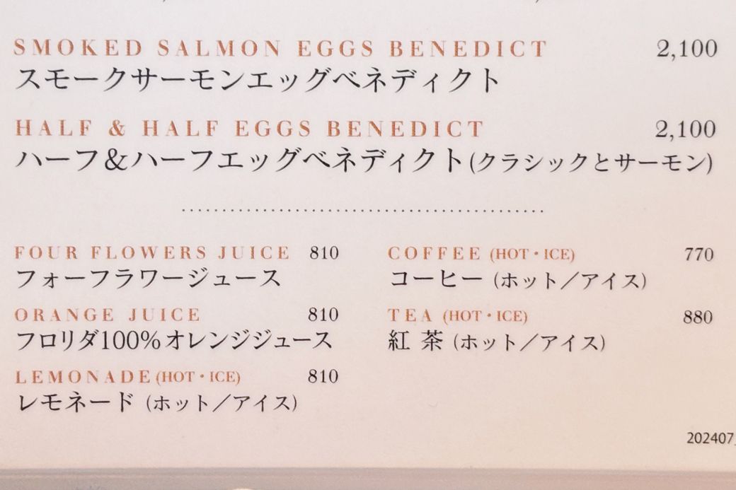 ドリンクメニュー。コーヒーは770円、紅茶は880円、ジュースが810円(筆者撮影)