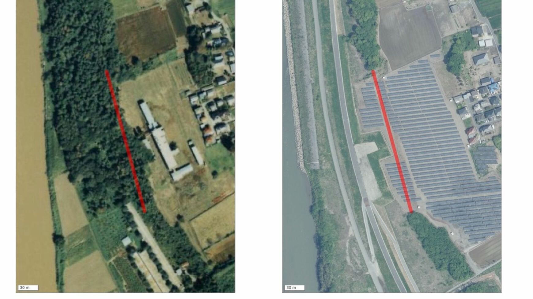 記事に戻る 鬼怒川水害「二審勝訴」でも原告に笑顔ない事情 堤防整備のあり方を問題視したが、認められずの写真一覧 下に画像が続きます (左)1987~1990年撮影の写真では赤線の位置に緑の砂丘林があった(右)2021年5月撮影の写真では砂丘林は消えている(二つの写真は国土地理院のウェブサイトから、ごん屋が地理院タイルを加工して赤線を書き込み、作成) 4/7
