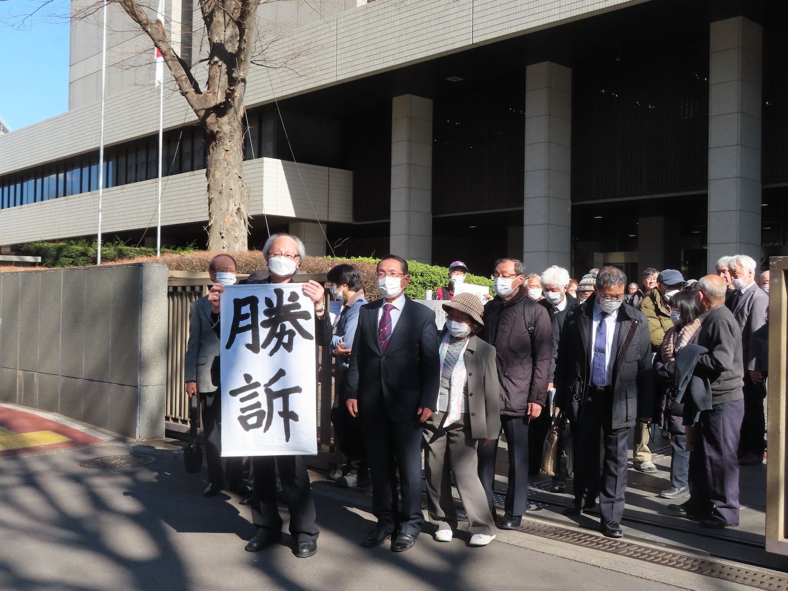 判決後、「勝訴」の旗を掲げる住民たちの表情は硬かった(撮影:河野博子)