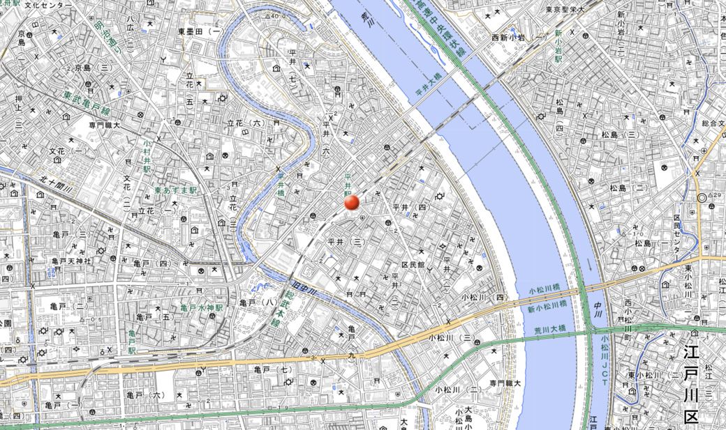 記事に戻る 23区なのに「陸の孤島」都民も知らない街の実態 ほったらかしにされてきた土地「江戸川区平井」の写真一覧 下に画像が続きます 川に囲まれた街。赤い点で示した場所が平井駅だ(国土地理院 電子国土Webから筆者作成) 7/17